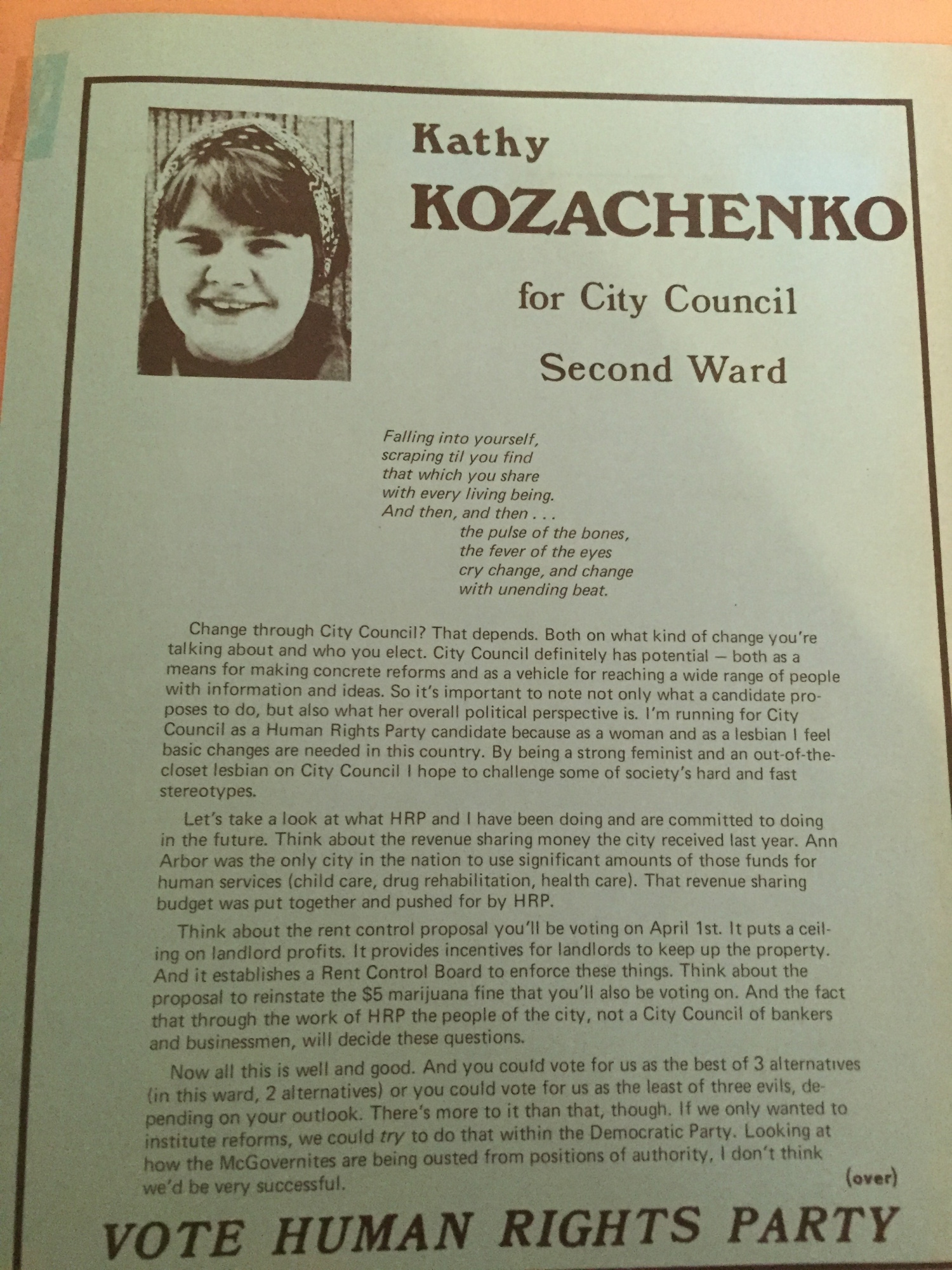 Kozachenko joined the Human Rights Party in the early 1970s. The differences between the platforms of the HRP and local Democrats dwindled, yet "Kozachenko's run as an out Lesbian ... provided her with a distinction to set her apart". She would go on to comment that "'the Democratic Party started to look and sound like us, so the students found no need to vote for us if they were saying the same thing, so we found something different to say'".
